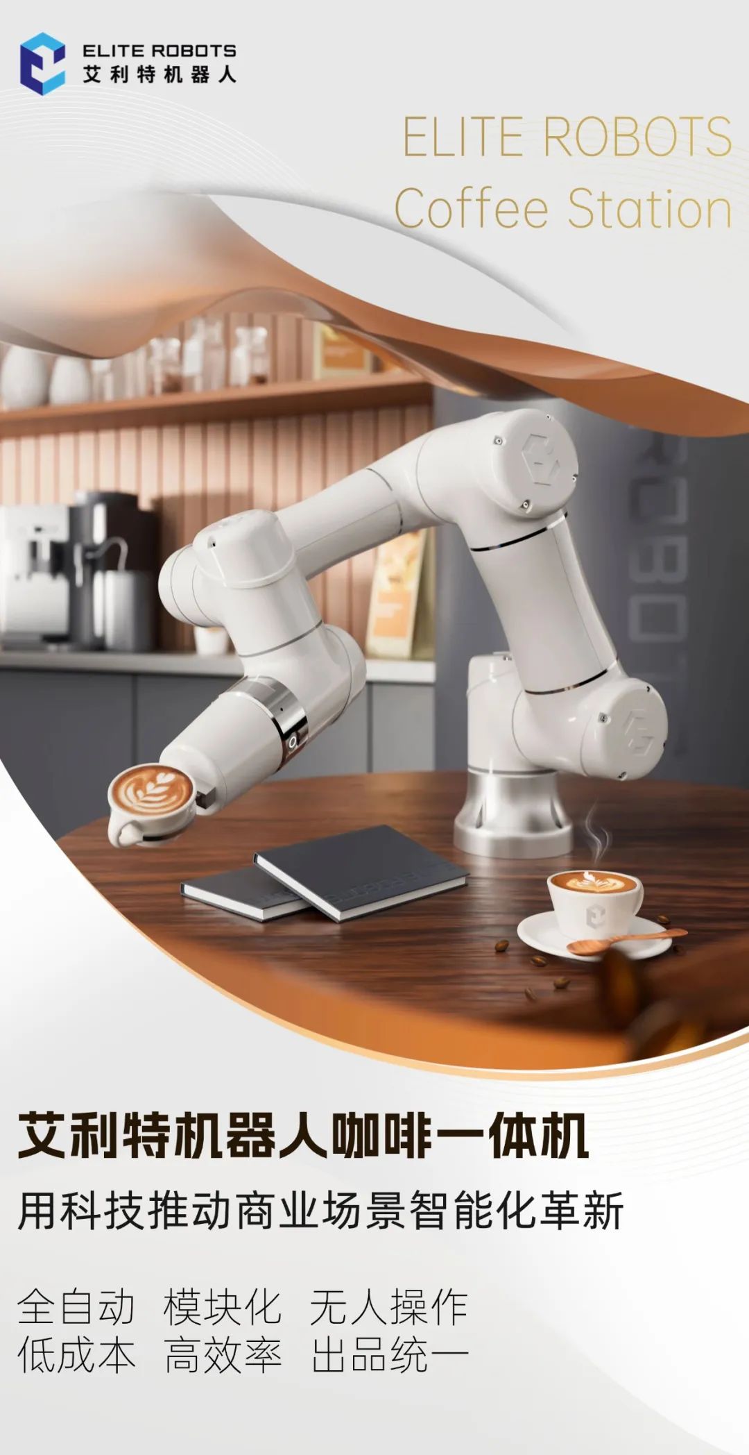 机器人咖啡一体机还添加了多个自动化模块,搭载“自助点单、自动取杯、自动取冰、自动打奶泡、自动清洗奶缸”等程序,可全自动制作一杯拉花精致、口味甘醇的高品质现磨咖啡,质量标准,口味稳定、出品一致,每杯咖啡的口感和品质都能达到专业大师级制作水准。