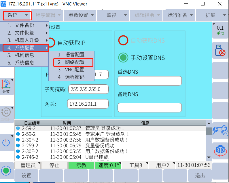 点击系统--系统配置---网络配置---输入IP 子网掩码 以及网关----输入完成后点击设置