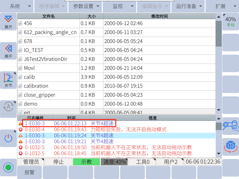 在按末端按钮进行拖动的情况下,如果点击按钮瞬间就拖动就会出现此类报警,G22恒峰应