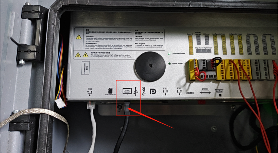 2.3. 用手捏住红色箭头所指处,拔下示教器插头,即可取出示教器。