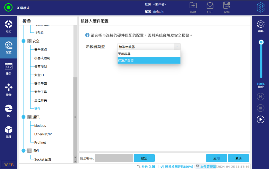 2.10. 输入完密码后,在示教器类型选择框里,选择无示教器。