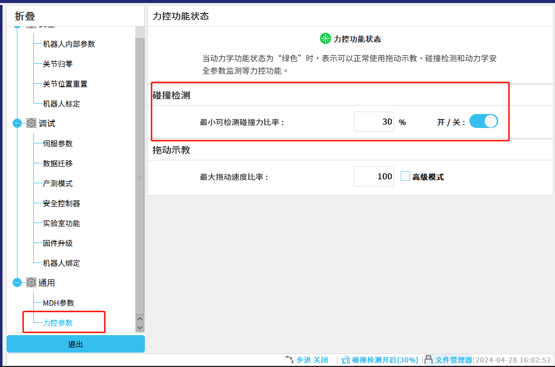 在力控参数栏目,也可修改碰撞灵敏度。修改完成后,点击退出即可。